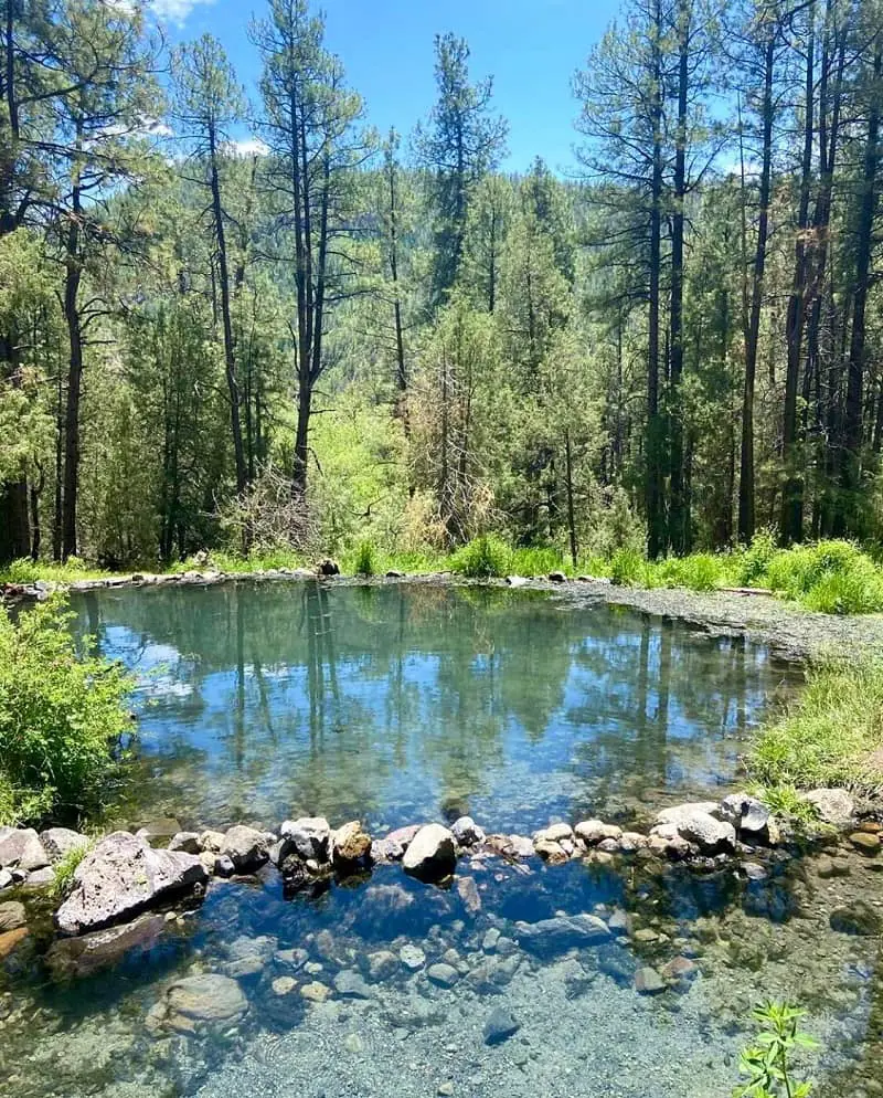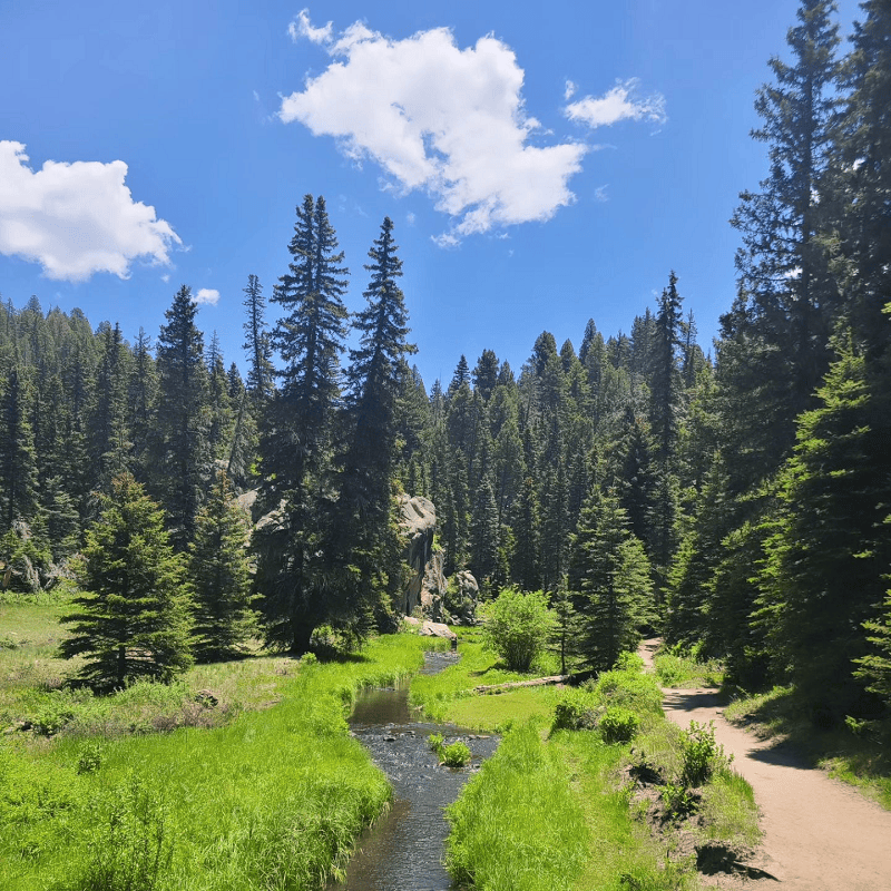 The next short and easy route with a family-friendly environment is located near Jemez Springs, New Mexico. The hike begins at the campground and tall pine trees along the trail provide enough shade providing a cool environment to the hikers.